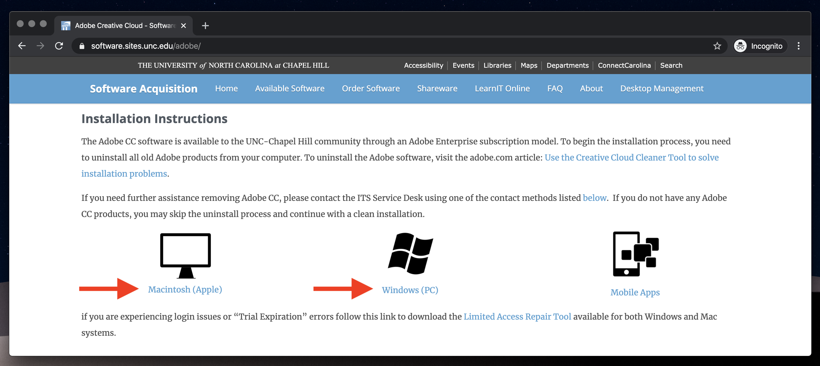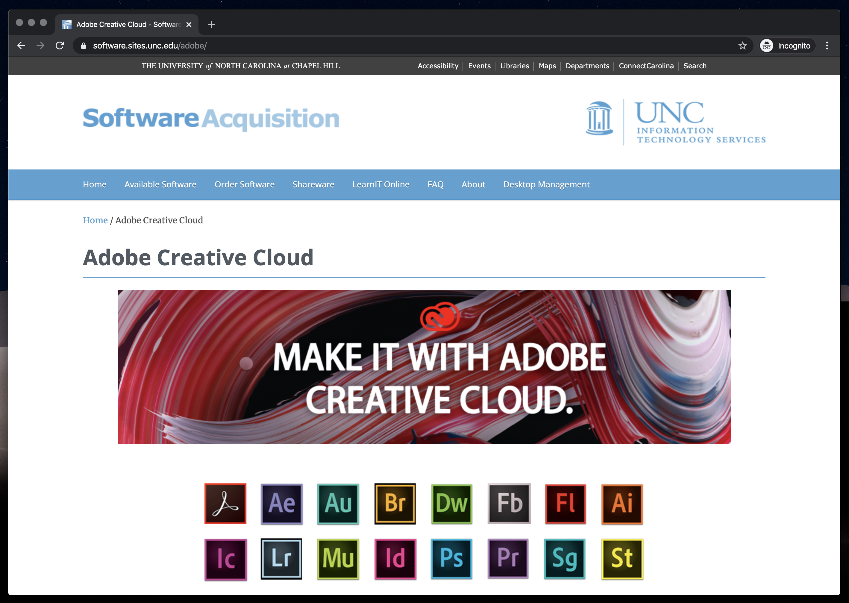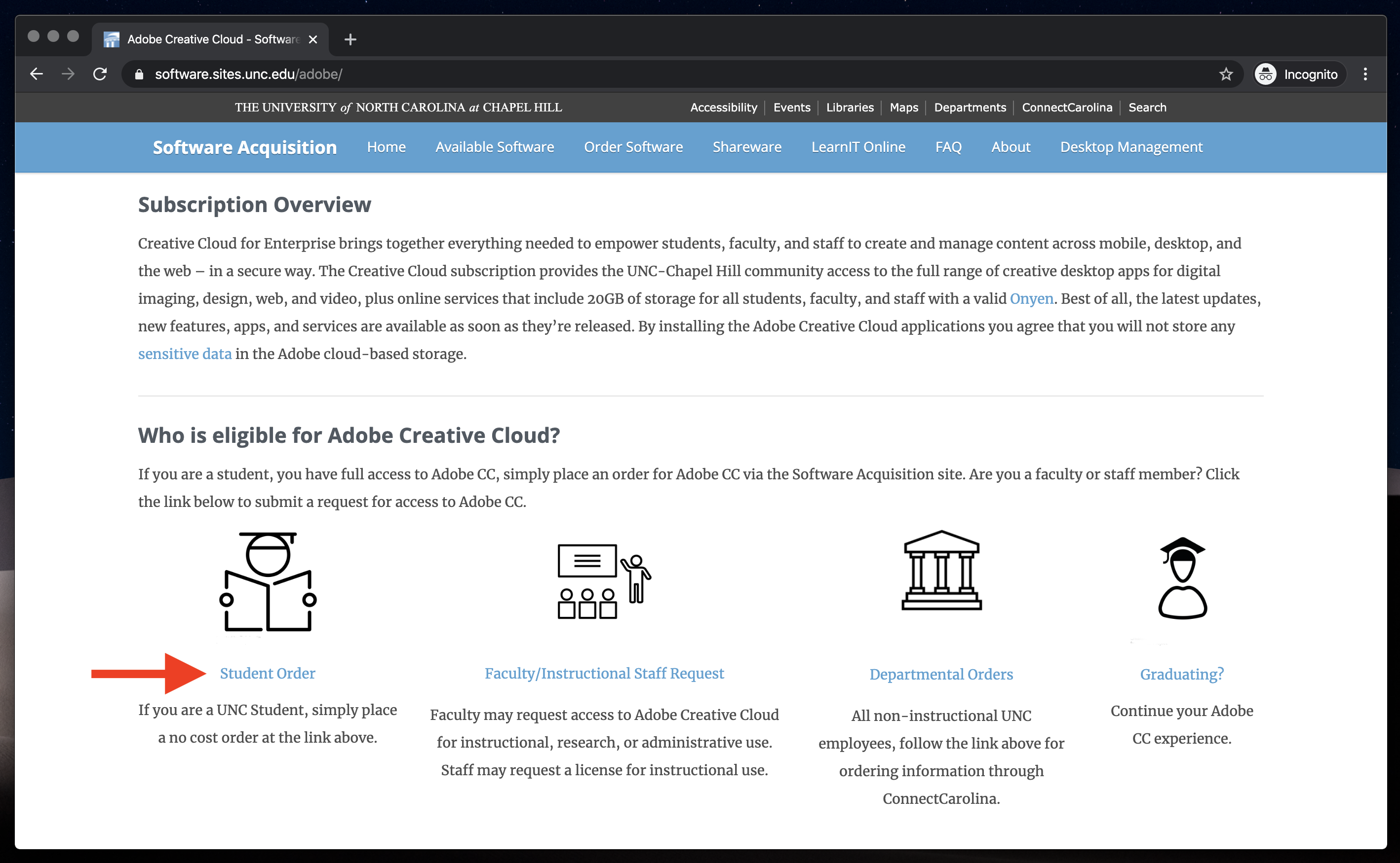 Click the Student Order link to request access to Adobe Creative Cloud. This will be free so long as your a student at The University of North Carolina at Chapel Hill.