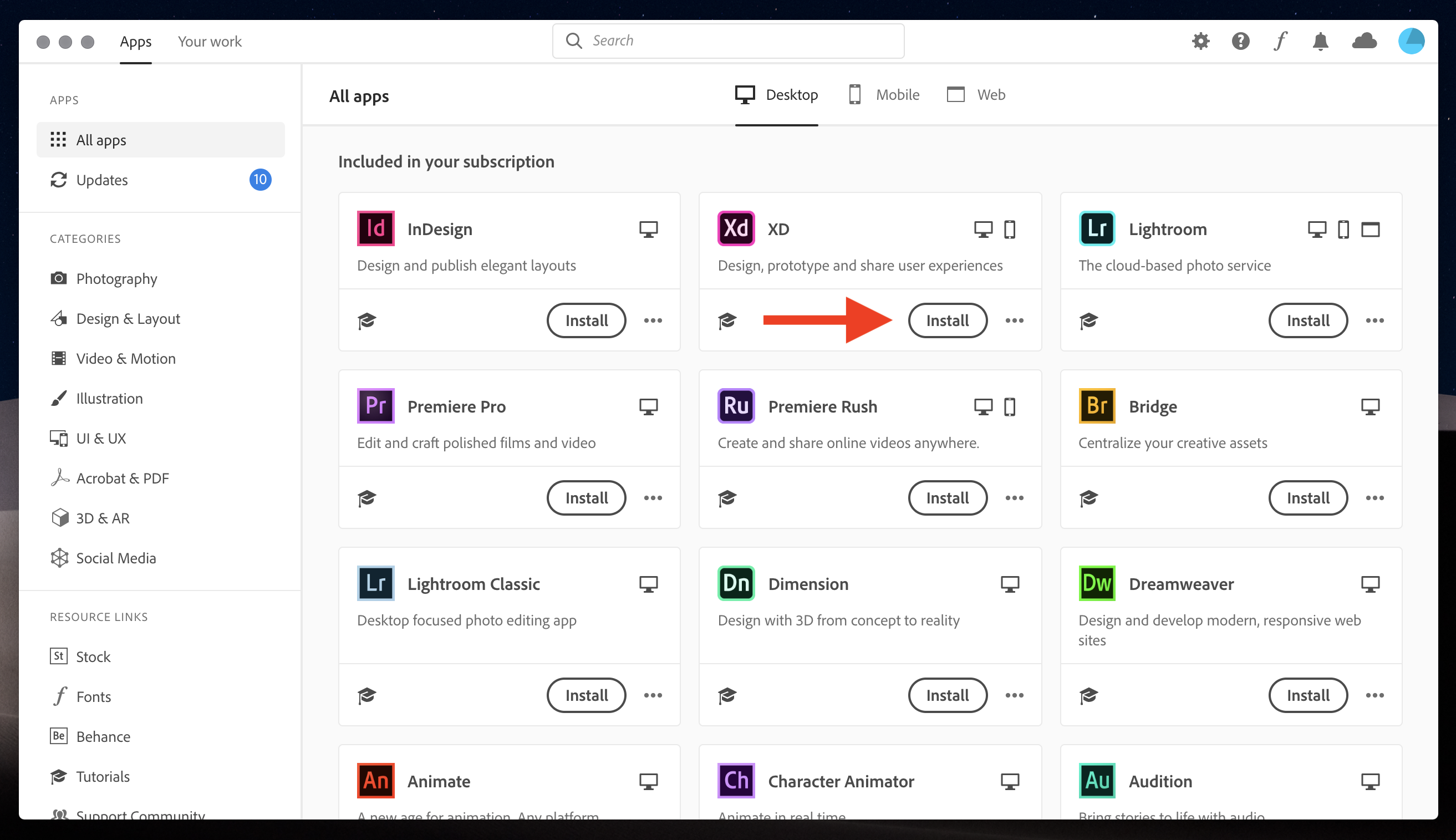 Once Adobe Creative Cloud is installed and lauched, click Install to install Adobe XD.